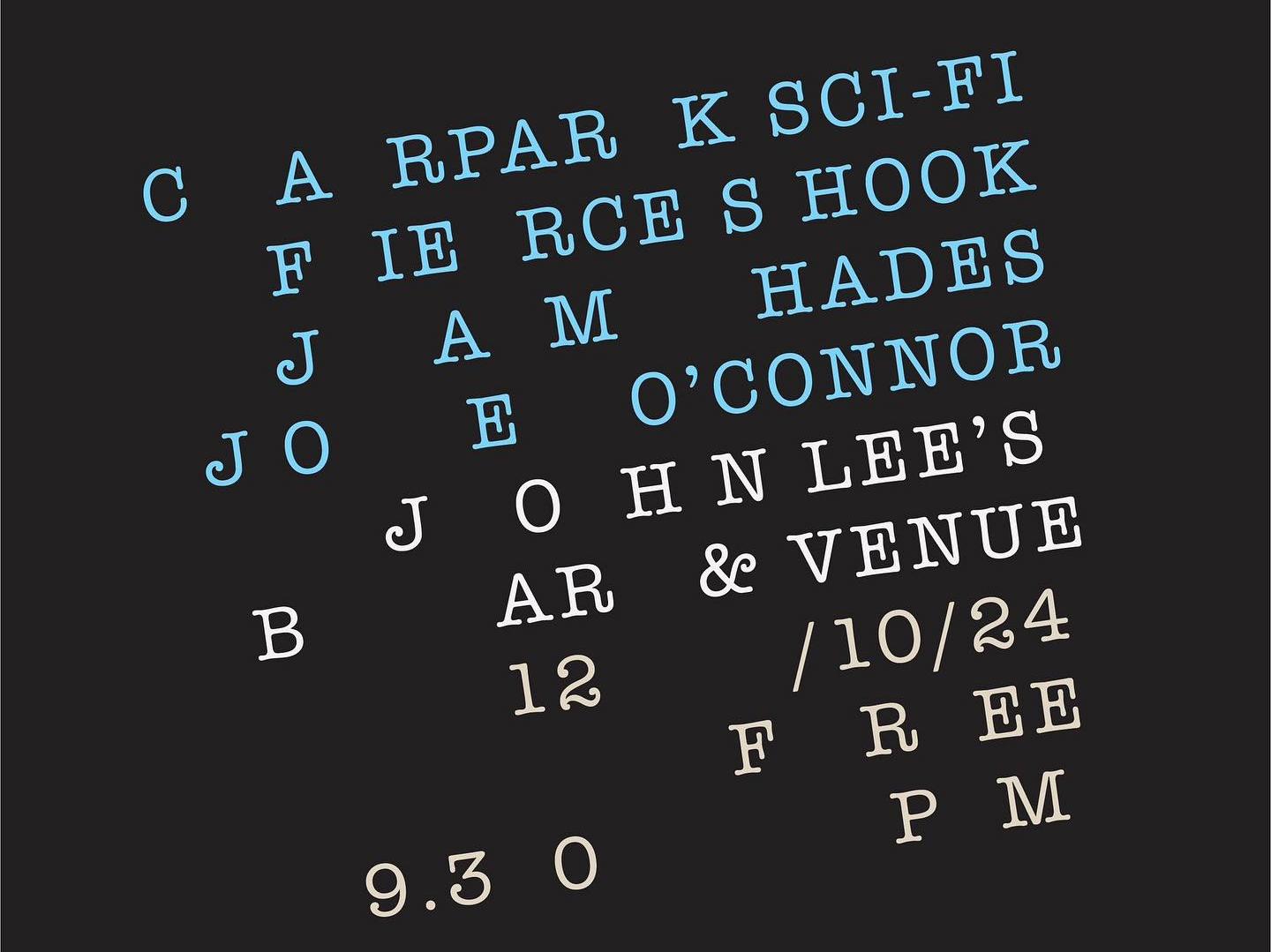 We are proud to welcome the excellent Carpark Sci-Fi (@gavcowley), @fierceshook, @jam_hades2020, and Joe O'Connor on Saturday 12th October from 9:30pm
