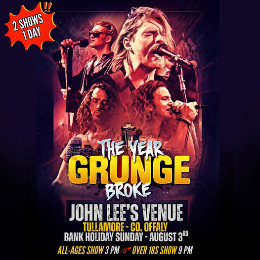 𝗧𝗛𝗘 𝗬𝗘𝗔𝗥 𝗚𝗥𝗨𝗡𝗚𝗘 𝗕𝗥𝗢𝗞𝗘 - 𝗟𝗜𝗩𝗘 at the John Lee's Bar and Venue, Tullamore, Bank Holiday Sunday 3rd August. After explosive sets at Electric Picnic and Forest Fest last summer, tours of the UK and spectacular shows throughout Ireland. The YEAR Grunge BROKE return to Tullamore this August, 𝗘𝗔𝗥𝗟𝗬 𝗕𝗢𝗢𝗞𝗜𝗡𝗚 𝗔𝗗𝗩𝗜𝗦𝗘𝗗!