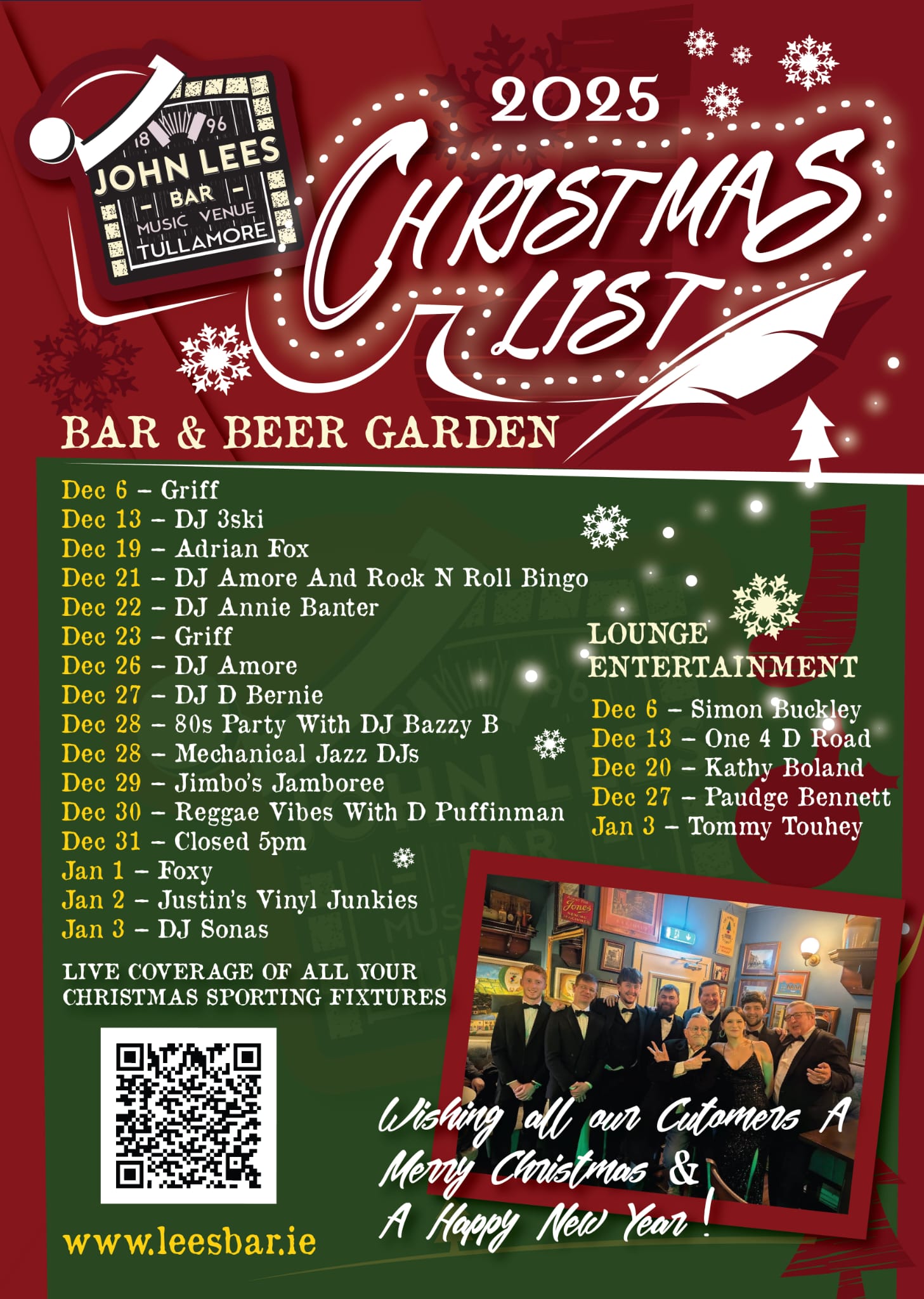 We invite you to join us for our festive line up, which has live music, electronic DJs and vinyl DJs, together with the classic ballad entertainment with the Lee's favourites.